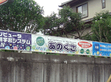 デパート、企業、学校などで使用される懸垂幕や横断幕。今まではカッティング文字主体の単調な物しかありませんでした。グラフィックシートのクロスやターポリン素材を使用すれば明るく華やかなイラストや写真と組み合わせる事も自由にできます。